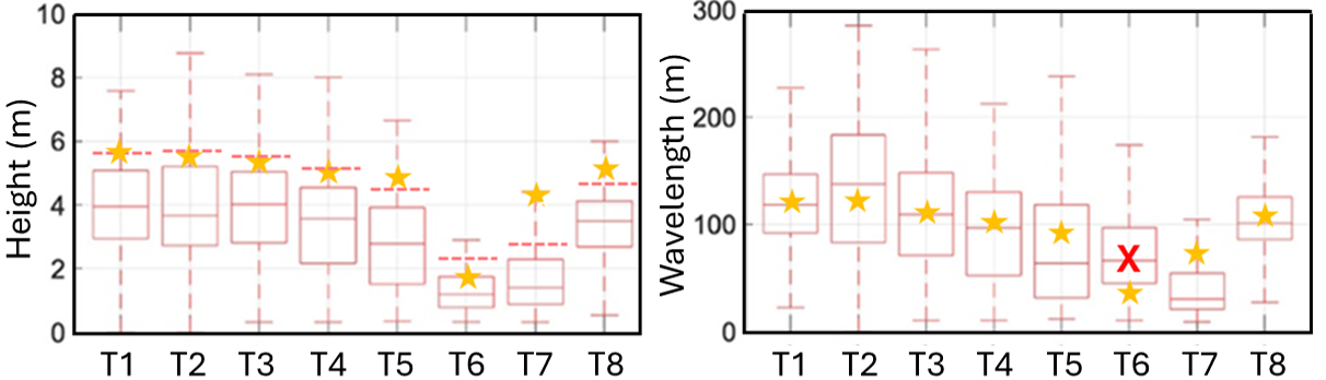 Comparison of height and wavelength predictions (stars) with measurements (box plots) in the Mississippi river (Doré and Coco, 2025)
